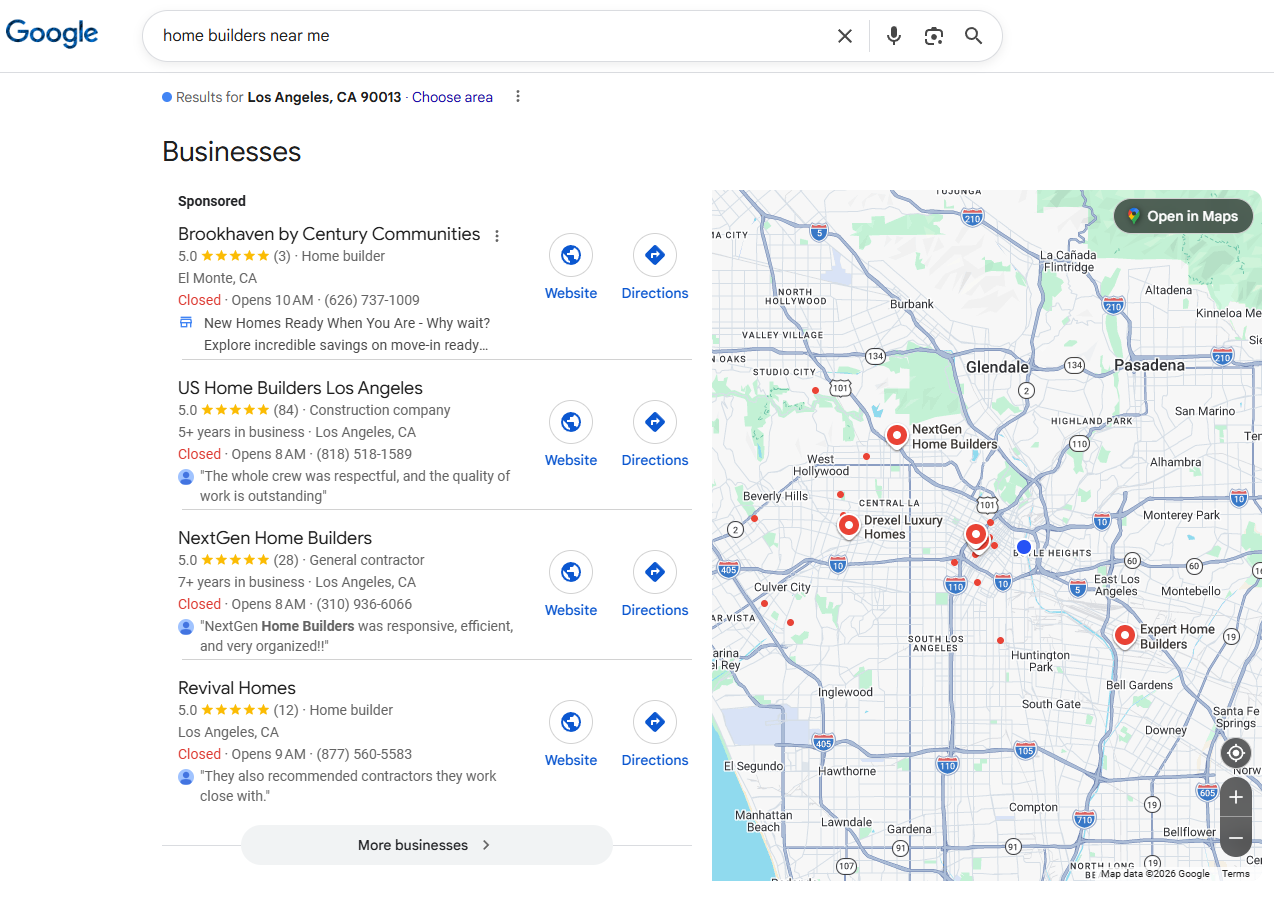 We optimize your website, Google Business Profile, and listings so you rank for searches like “contractor near me” or “home builder Los Angeles.” Our construction marketing agency strategies put you in front of homeowners, developers, and businesses planning projects.