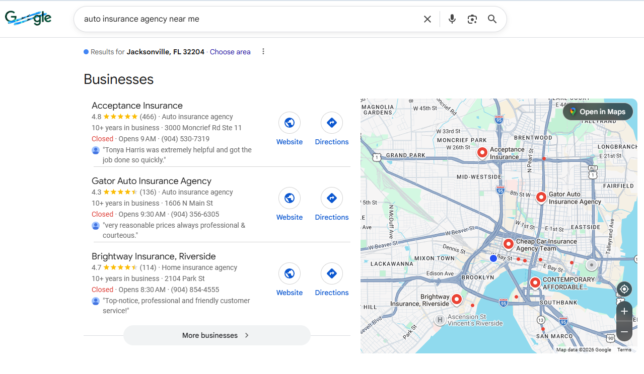 We optimize your website, Google Business Profile, and local listings for searches like “insurance agency near me,” “auto insurance Jacksonville,” and “home insurance Jacksonville FL.” Our insurance marketing services help agencies appear in high-intent searches across Southside, Arlington, Mandarin, and Jacksonville Beach.