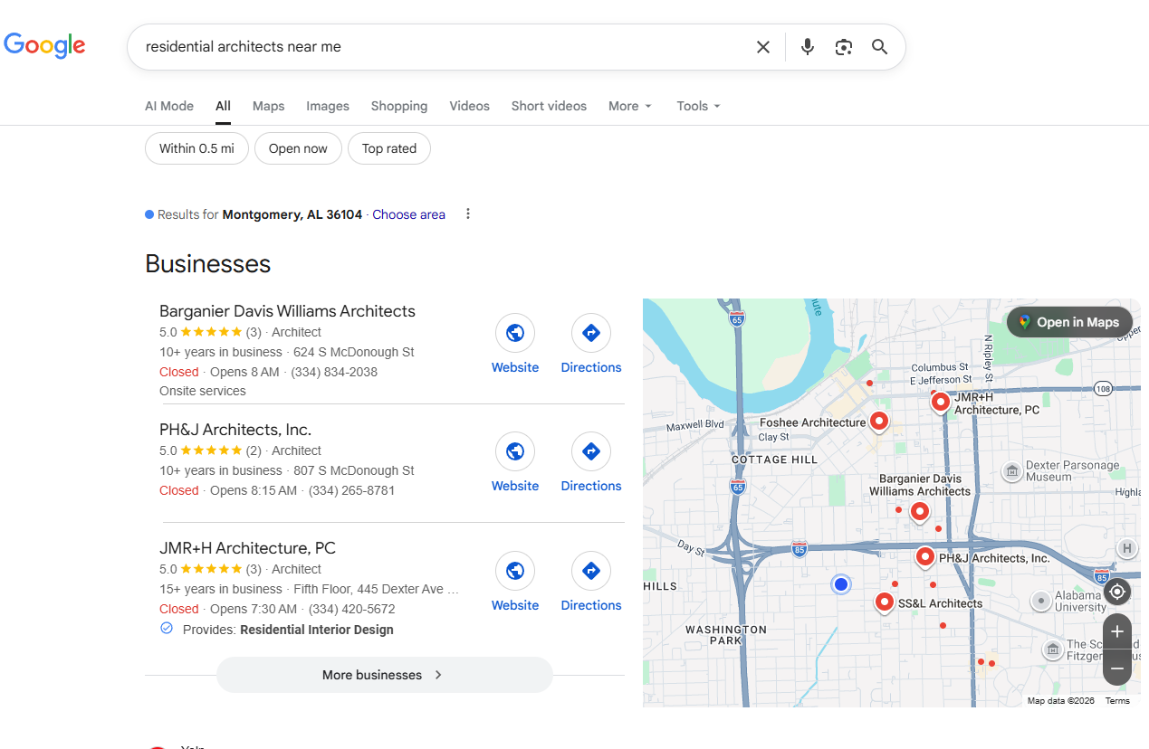 Local visibility is key. We optimize your website, Google Business Profile, and listings so seo services for architects help your firm rank in Birmingham, Huntsville, Mobile, and Montgomery for searches like “architect near me.”