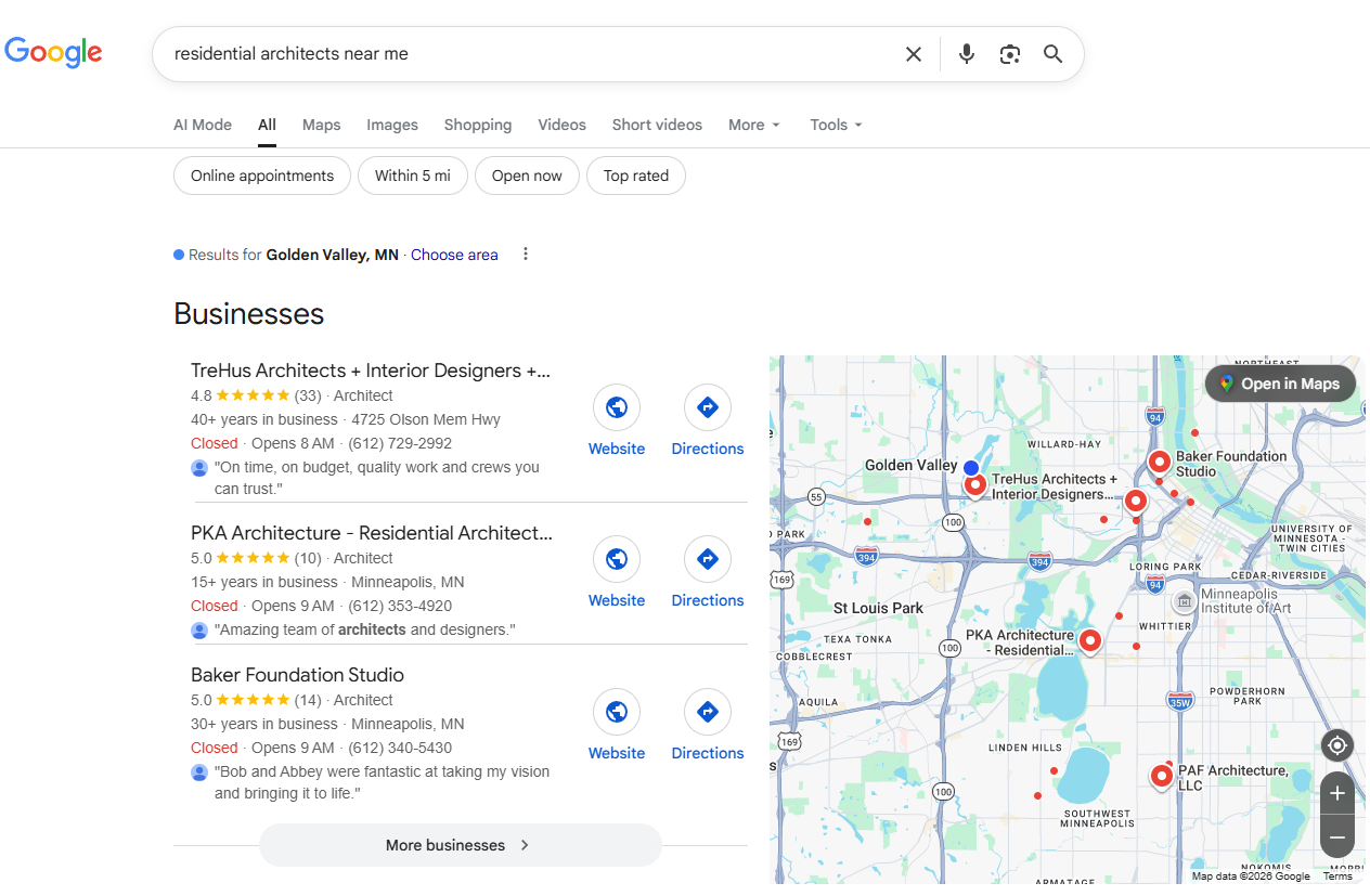 We optimize your website, Google Business Profile, and regional listings to rank for searches like “architect near me” or “commercial architect Minneapolis.” With our seo services for architects, your firm becomes visible when Minnesota clients are ready to hire design professionals in Minneapolis, St. Paul, Bloomington, or Edina.