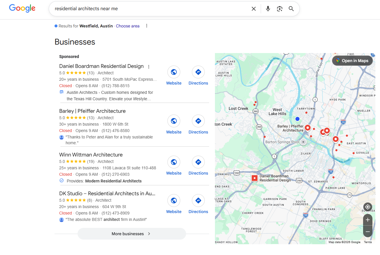 We optimize your website, Google Business Profile, and local listings for searches like “architect near me,” “residential architect Houston,” or “architecture firm Austin,” ensuring visibility where Texas clients plan projects.