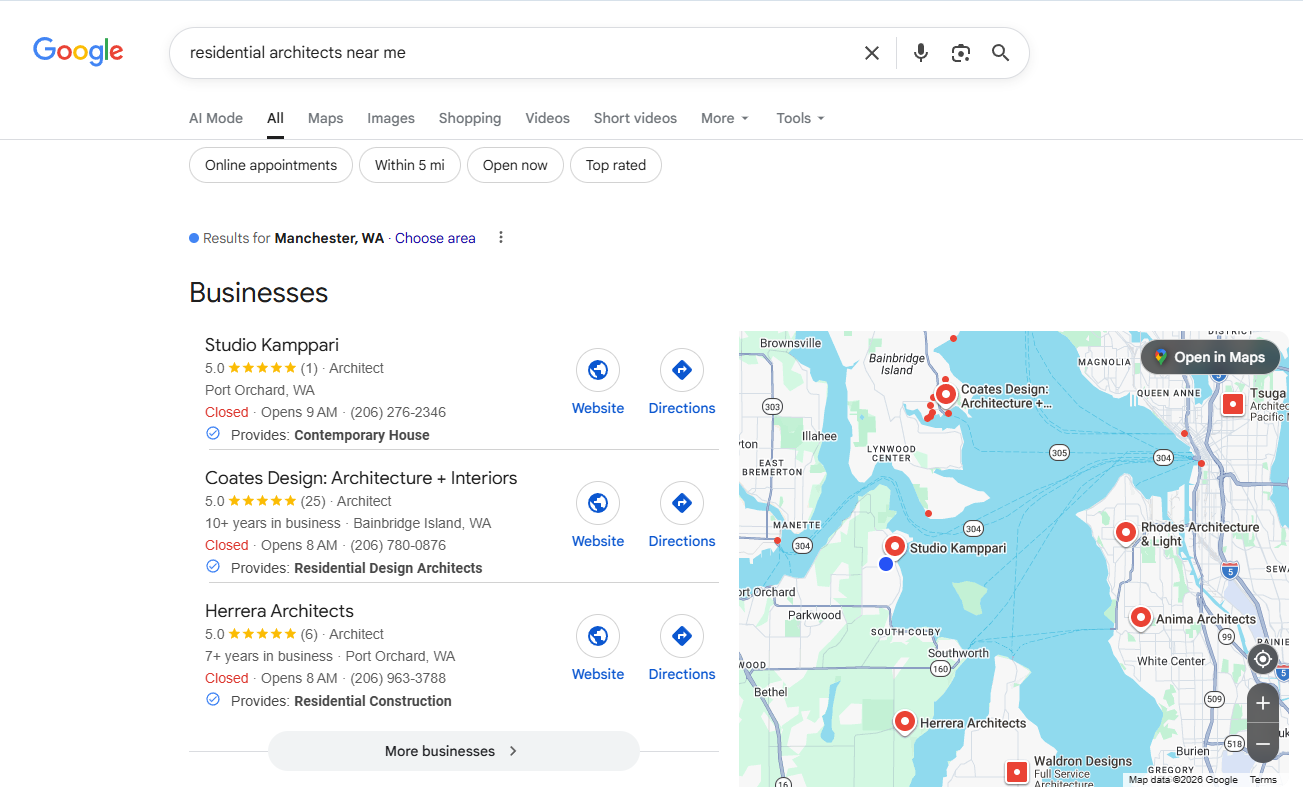 We optimize your website, Google Business Profile, and local listings so your firm ranks for searches like “architect near me” or “residential architect Seattle.” Our seo for architects ensures your firm appears where Washington clients plan new builds, renovations, and commercial projects.