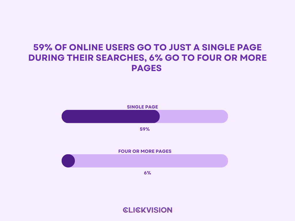 - 59% of online users go to just a single page during their searches, while 6% go to four or more pages. (Source: Backlinko)