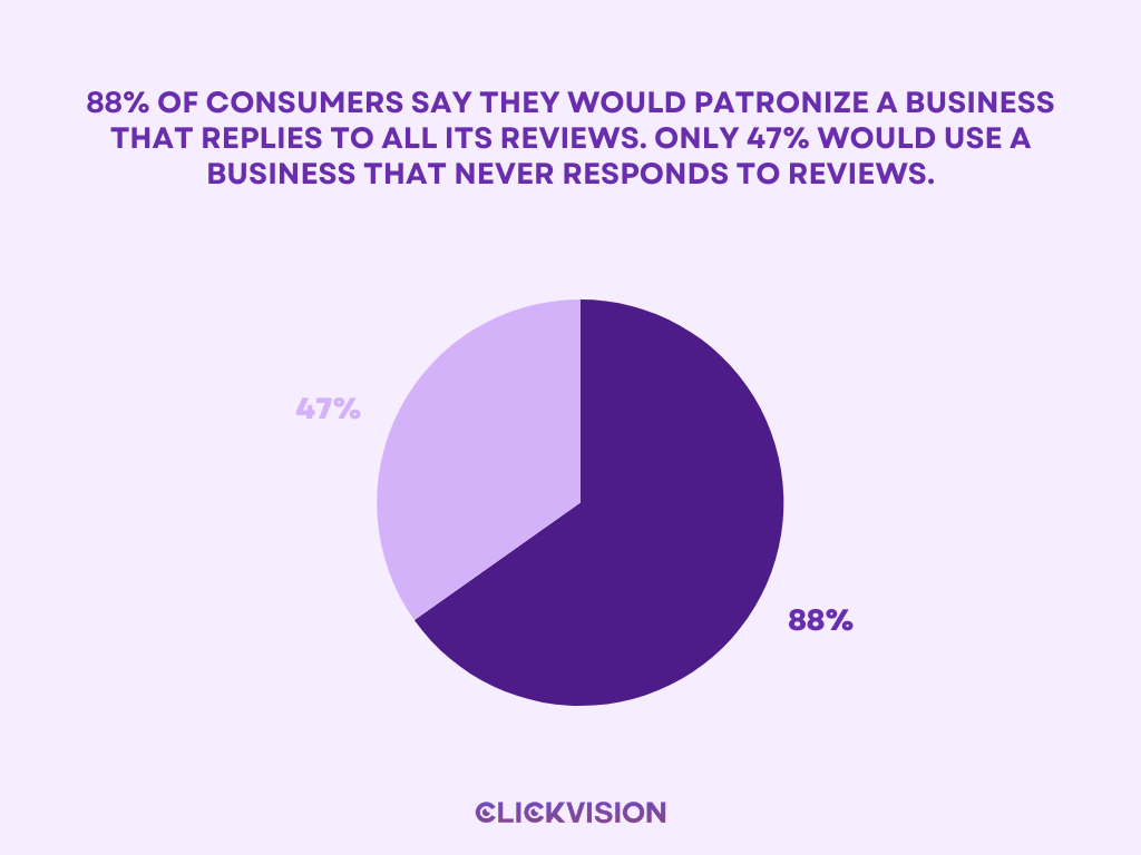 - 88% of consumers say they would patronize a business that replies to all its reviews. (Source: BrightLocal)