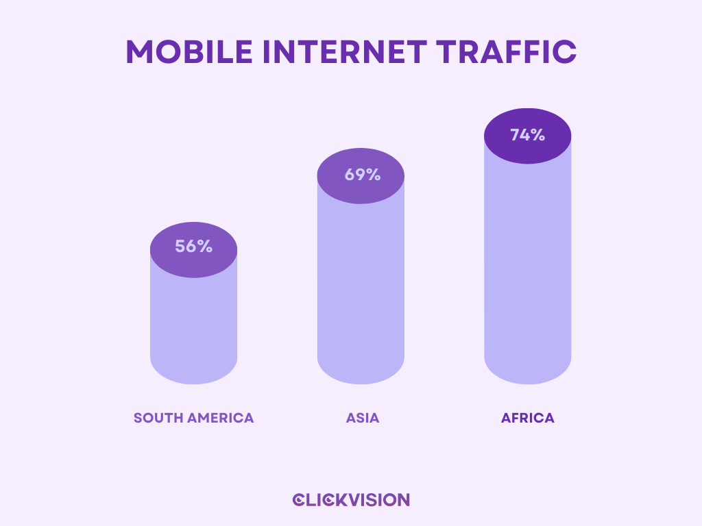 - Mobile internet traffic as a percentage of total traffic is highest in Africa (74%), Asia (69%), and South America (56%). (Source: Statista)